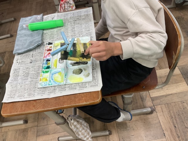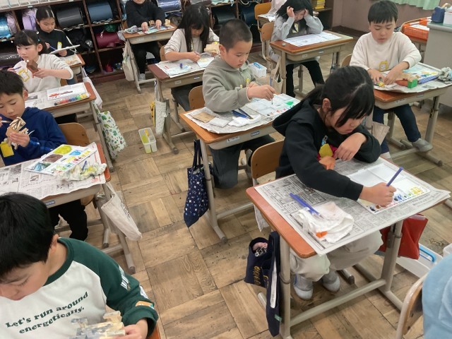 「トントンどんどんくぎうって」の学習の仕上げに作品の色塗りをしています。粘土とは違って曲線に表現できない分、木をどのように組み合わせると釘がうちやすいのかを考えることが面白さの一つでもありました。色をつけると、自分が作りたかったものが目に見えてきて、愛着も湧き出します。