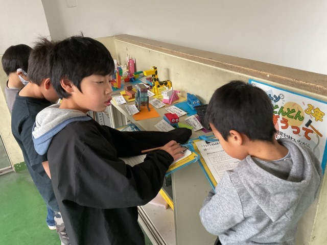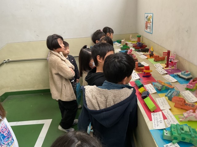 友達の作品を見て、形のおもしろさなどを見つけて発表しました。「足が動いて工夫されているよ。」「耳のところがヤスリで削っていて面白いな。」「色あいがとてもきれい。」など自分ではこんな発想やアイデアが思いつかないと言って感心している様子でした。家に持って帰って飾るのを楽しみにしているようです。