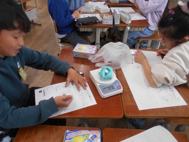 形を変えると重さは変化するのかどうかを実験しています。