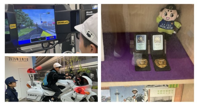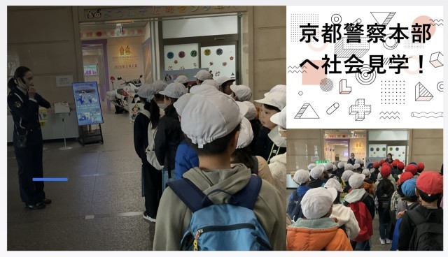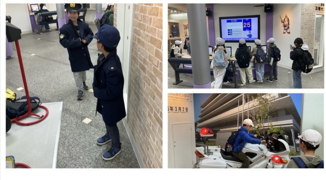 京都府警へ見学へ行きました。制服を着たり白バイに乗ってみたり体験するコーナーでは、楽しく学びました。司令センターでは、真剣にたくさんのモニターを見て、私たちの安全を見守ってくれている警察の方の仕事を拝見しました。実際の信号機や標識の大きさにも触れて、たくさん学ぶことができました。