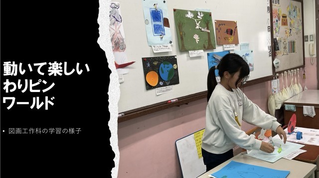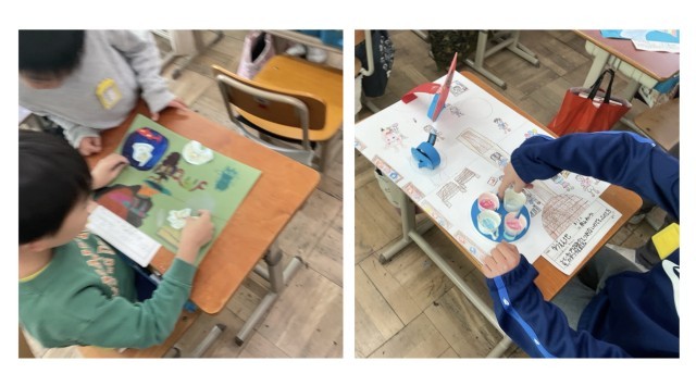 図画工作科では、回る・縦や横に動く面白さを生かして、紙のつなぎ方や材料の使い方を工夫して作りました。物語のような作品や夢の世界を表現した作品など「どこが動くと面白いかな」と考えながらどんどん想像がふくらんでいく姿が見られました。最後には、お互いの作品を鑑賞して良いところや面白いところを伝え合いました。