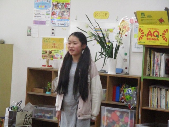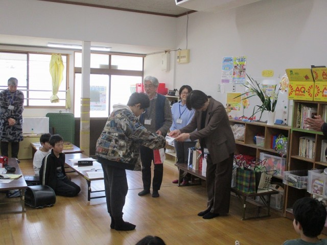6年生の放課後まなび教室の閉講式がありました。今年は19名の6年生が放課後まなび教室に参加していました。中には6年間放課後まなび教室に通った人もいました。放課後に宿題をしたり工作をしたりする場所をつくっていただき、サポートしていただいたスタッフのみなさんに感謝の思いを伝えました。6年生は、スタッフのみなさんの手作り卒業記念品をいただきました。