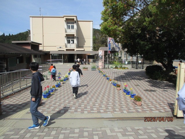 その花々を6年生が入学式の前日に並べてくれました。校門から体育館に向けての花の道はいかがでしたでしょうか。入学式当日はあいにくの雨でしたが、濡れた花々はいっそう輝いていました。これから学校でいろいろなものを見つけていきましょう。