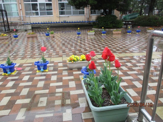 2年生が昨年秋から育ててくれたチューリップや、昨年度の栽培委員が育てたチューリップも何とか咲いていてくれました。みなさんの入学を祝福しています。