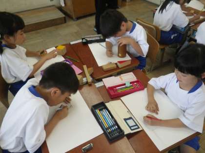 いろいろな形の積み木を画用紙にうつして,絵を描きました。