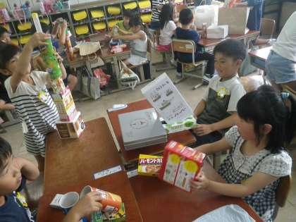 お家で集めてきてもらったいろいろな箱・缶などを組み合わせ,班で協力していろいろなものを作りました。東京タワー,きりん,電車,船,などができました。