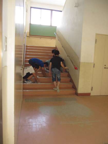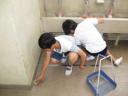 本年度の活動から「すみっこそうじ」を取り入れました。委員会の時間に使い古した雑巾を使って学校の隅々を綺麗にしています。雑巾も最後まで使い切ることができ,校内も美しくなる,まさに「美化・エコ」な活動です。一所懸命掃除をする高学年の姿がとても立派です。