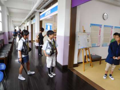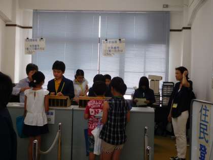 区役所と富士ゼロックスとセコムの警備の様子です。区役所では,住民登録をするお客様に一人一人ていねいに対応していました。富士ゼロックスでは,オリジナルの名刺が作れるということをたくさんアピールしていました。セコムの警備係の子たちは制服をきて,各会社に異常がないか見回っていました。どの子も一生懸命働いていました。