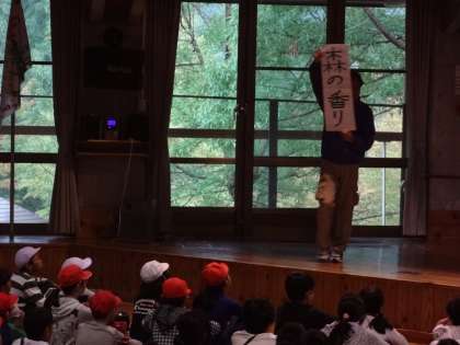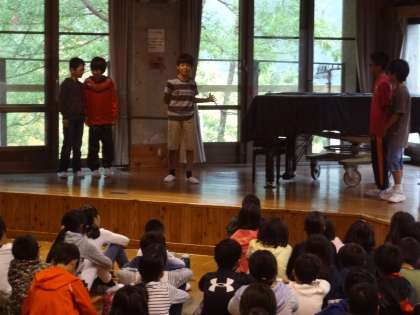 7時より早速4校合同の朝の集いが行われました。所員の方のお話を聞いた後,各校が学校紹介をしました。岩倉南小学校の学校紹介は,劇とクイズを通して他校のお友達にわかりやく伝えていました。