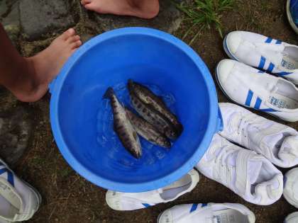 曇り空ですが,おがま池にて魚つかみを体験することができました。池に放流されたアマゴを捕まえるのですが,泳ぎがはやくなかなか捕まえられません。でも,一人が捕まえると,みんなのやる気も一気にあがり,アマゴを一生懸命追いかけていました。