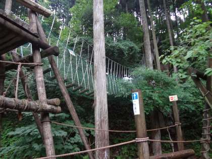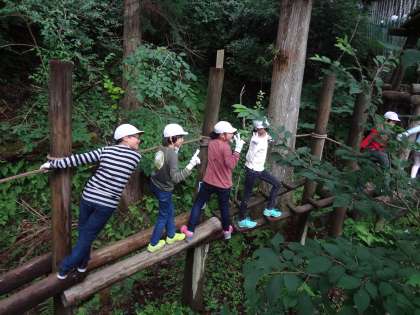 曇り空のままですが,冒険の森(アスレチック)も実施することができました。2人の先生が,この後の野外炊事のまきチケットをもってどこかにいるので,先生を探して冒険です。