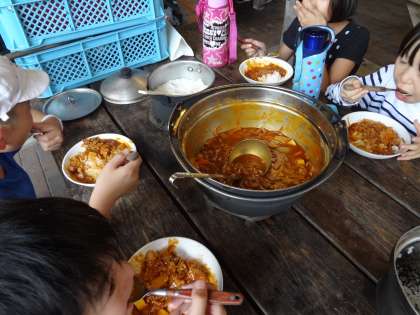 今日の夕ご飯は,ハヤシライスです。昨日より手際よく火おこしも調理もすることができました。昨日の学びが活かされていますね。