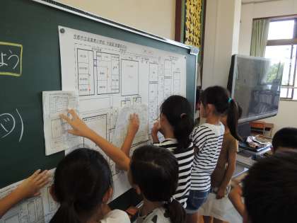 社会科の「火事をふせぐ」学習で,校内の消防設備について調べました。消火器や火災報知器,消火栓や防火扉などを校舎配置図に記しながら校内をじっくりと回りました。消火栓の中も実際に見ました。見つけた消防設備を,拡大した校舎配置図に○シールでまとめると,かなりの数に驚いている子もいたようです。いつどこで火事が起きてもすぐに消せるようにいろいろなところに消防設備が設置されていることが分かりました。