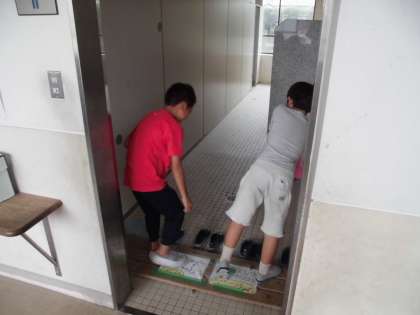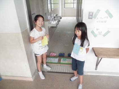 スリッパそろえ隊の活動です。次に使う人の身になって,揃えておくようにお手本をしめしています。
