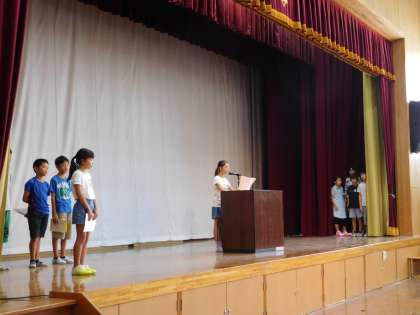みんなの日では,5年生が全校の前で発表しました。各クラス一人ずつ代表者が「長期宿泊学習,花背山の家」の感想をスピーチしました。どの子も花背山の家だからこそできた体験を自分なりの言葉で表現できていました。下級生からは「花背山の家に行くのが楽しみになりました。」という感想をもらい,5年生の思いが伝わったことと思います。花背山の家の体験をこれからの生活にもいかしていってほしいと思います。