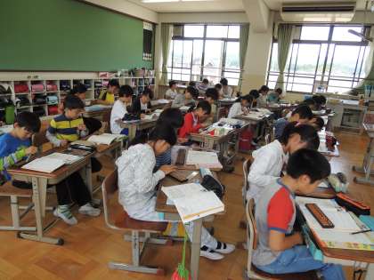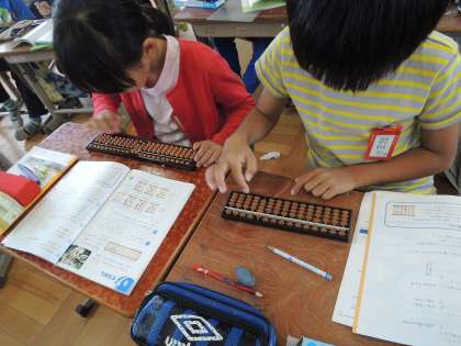 3年生のときに学習しているそろばん。4年生では小数が加わりました。なかなか苦戦している様子でしたが,まわりの友だちと確認しながら集中して取り組んでいました。