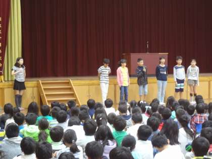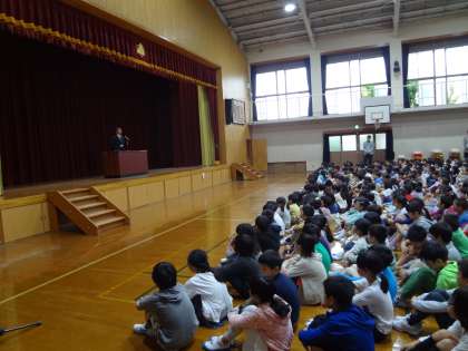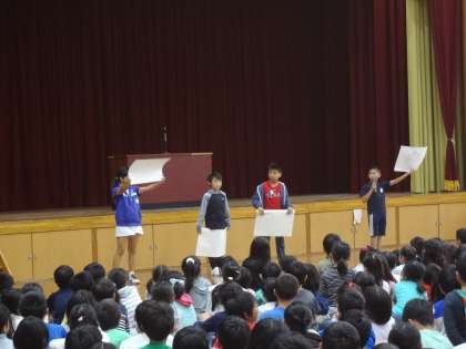 校長先生から前期の間,大切にしていた「やさしさと思いやり」について,通知票「あゆみ」についてお話がありました。校長先生のお話をみんな真剣に聞くことが出来ました。 その後,計画委員から月目標のふり返り,栽培委員から植物についてのクイズがありました。三連休明けからは,後期になります。心新たに学校生活を送ってほしいと思います。