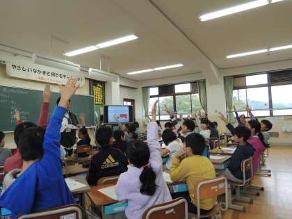 藤井先生による食の指導です。前回は「魚パワー」について教えていただきました。今回は食べ物の旬についてのお話です。そもそも「旬」って何なのか・・・。食べ物がたくさん取れ,一番おいしく栄養がたくさんある時期のことを「旬」というそうです。キャベツ,トマト,きゅうり,れんこん,ごぼう,だいこんの「旬」はいつか,畑ではどこでできるかなど楽しく学びました。今の時期,「旬」の食べ物と言えば・・・れんこんやごぼう以外にも秋刀魚や柿など,いろいろあります。一番おいしく栄養がたくさんある時期にぜひ食べたいですね。