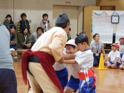 左京北支部育成学級の合同行事「なかよし運動会」が行われました。大きなバルーンをみんなで動かして楽しむ「バルーンであそぼう」,おすもうさんを倒してゴールを目指す「ハッケヨーイ・ドン」など,南小の運動会とはまた一味違う競技も楽しめます。この日のために練習を重ねた子どもたちは,精一杯力を発揮して,全ての競技に取り組みました。