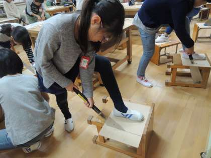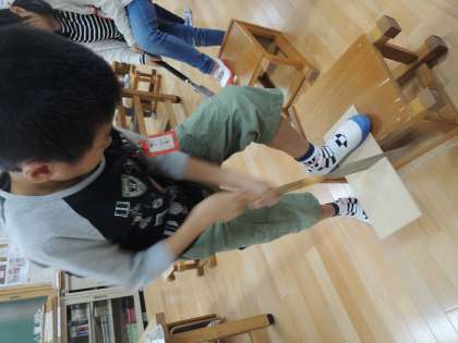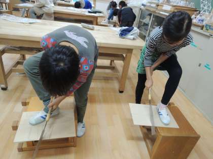 図画工作科でのこぎりにチャレンジです!「まっすぐ切るのが難しい〜!」「こし痛くなってきた〜!」と言いながらもみんなよくがんばっていました。切ったパーツを組み合わせてどんな作品が出来上がるのでしょう。楽しみです!