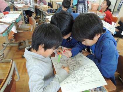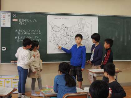 社会科で「事故や事件を防ぐ」の学習をしています。今日は,校区の安全マップを作りました。家の近所や通学路,よく遊びに行くところで危険だと思うところに印をつけていきます。友達と話し合いながら危険だと思う理由も吹き出しで書いていきました。全体での交流では,自分のマップと比べながら聞いていました。次回,安全マップを仕上げたいと思います。