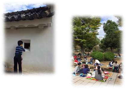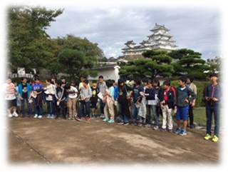 姫路城をバックに記念撮影。昼食は,お弁当をいただきました。