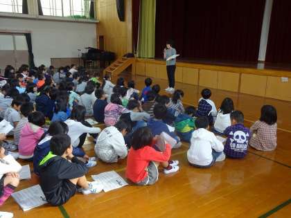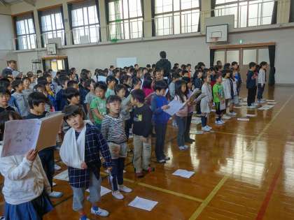 学芸会で発表する音楽の練習を,学年合同で行いました。きれいな歌声が体育館に広がりました。