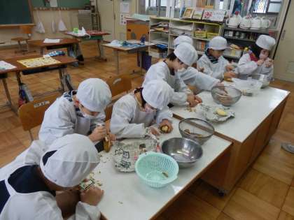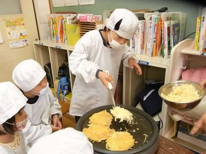 学校園で収穫したジャガイモを使い,「ジャガイモのガレット」を作りました。今までの調理で何度もジャガイモの皮むきに取り組んできたので,ピーラーの使い方も随分慣れた様子でした。包丁やスライサーを使い細切りにして,チーズと片栗粉を絡めてホットプレートでしっかり焼きました。見た目は,ジャガイモを使ったお好み焼きのようでした。サクッとした食感で,とても美味しかったです。6組のみんなが大好きな調理を通して,手順を考えて行動したり,安全な調理方法や協力して最後まで取り組むことをしたりと,生活に役立つ様々な学習をしています。