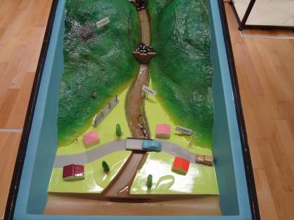 10月24日(火)京都府森づくり推進課の方に来てもらい,治山ダム土石流実験装置「がんばれ治山くん」の実演をしてもらいました。初めに森林のはたらきについてお話を聞きました。森林は,緑のダムのはたらきをすること,CO2を吸うので地球温暖化を防ぐはたらきがあることなどを,教えてもらいました。その後「がんばれ治山くん」の実演を見ました。治山ダムなどがないと,土砂で家や車や橋が流されてしまいます。治山ダムなど土砂をせき止める物があると,家も車も橋もぶじでした。その違いをはっきりとみることができる,実演でした。さらにその後治山くんクイズをして,学習を深めました。