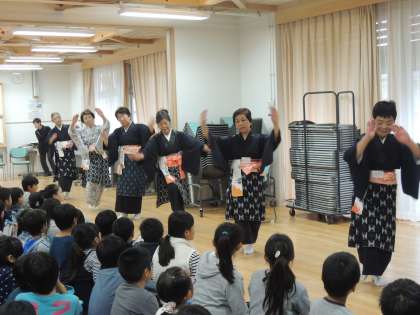 総合的な学習の時間では,わたしたちの住む岩倉の良さについて学習してきました。これからはさらに岩倉の歴史について学習をすすめていこうと考えています。そこで,岩倉の歴史に詳しい「岩倉南学区社会福祉協議会」の方々にお越しいただき,昔の岩倉について教えていただいたり,伝統的な踊りを披露していただいたりしました。これからさらに深く知りたいこと,調べたいことについて考える時間になりました。