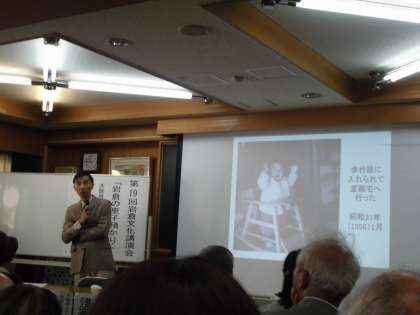 11月3日(金)の文化の日,明徳小学校で「第19回岩倉文化講演会」が開催されました。今回も,大阪府立大学の中村 治先生を講師にお迎えして,「岩倉の里子預かり」というテーマでご講演いただきました。中村先生は,岩倉の地で生まれ育ち,岩倉地域に関する著書をたくさん執筆されている先生です。