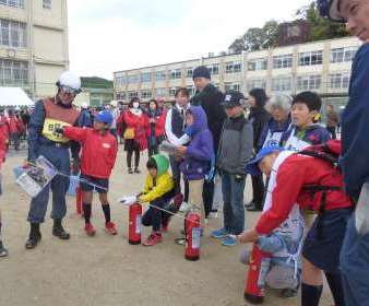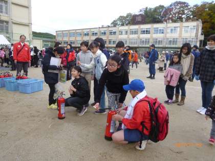 消火器を使う体験もさせていただきました。消火器も,実際に使い方を知っていると万が一何か事が起こった時に,役立ちます。なかなかあたらない!!とつぶやいている子どももいました。何事も体験が大切です。