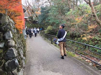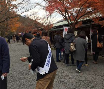 その後,大原三千院の参道付近で啓発活動を行いました。本校からPTA会長,副会長の2名が参加され,他府県から訪れた観光客に人権月間の取組をアピールしました。