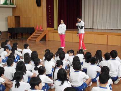 1月15日(月)の3校時に,3年生を対象に,かんぽ生命主催のラジオ体操出張授業が行われました。夏休み前,休み時間に全校児童を対象にラジオ体操を行ったり,3年生の有志でラジオ体操コンクールに応募したりしたことがきっかけで,今回の出張授業を実施することができました。