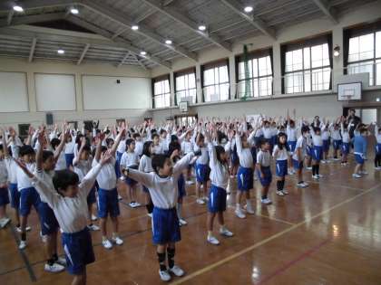 授業の後の子どもたちのふり返りでは,「体育館は寒かったけど,ラジオ体操をすると,体がポカポカになった。」「うでをピンと伸ばしたり,つま先立ちでバランスをとったりするのはむずかしかった」「ラジオ体操をするだけでよい運動になった」など,楽しく体を動かすことができました。講師の先生方のおかげで正しいラジオ体操の仕方を学ぶことができました。