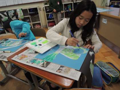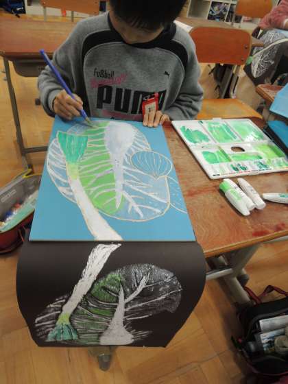 版画の色付けに取り組んでいます。きれいなグラデーションを表現できるよう,1回1回丁寧に色をのせ,刷っています。完成が楽しみです。
