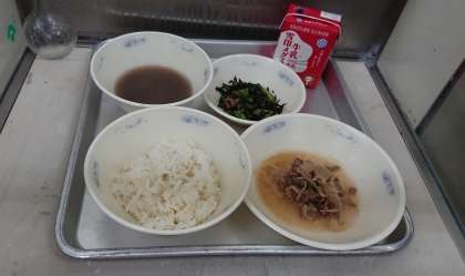今日の給食では手作りデザートのいもぜんざいが登場しました。