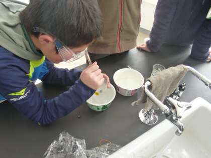 「ものをもっととかすには,どうしたらいいのだろう?」という疑問から実験をしました。食塩とホウ酸のとけ残りがある水溶液を,水を増やしたりあたためたりします。予想と結果がちがった子どもも多く,理科のおもしろさを感じました。