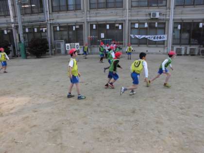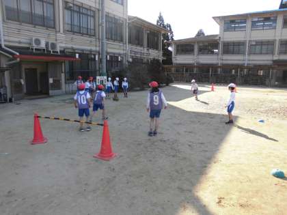 体育でサッカーを学習しています。ゴールが決目用とそれぞれがんばっています。