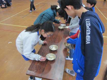 給食週間の取り組みとして,給食委員会主催で「豆つまみ大会」が行われました。鉄のはしで食器から食器に豆を移動させるリレーです。なかなか難しく,苦労している子がたくさんいました。結果は…2組の優勝でした。