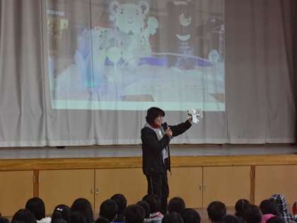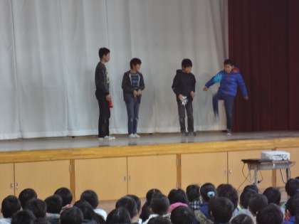 日本と韓国の挨拶や服装,遊びの違いについての話もあり,6年生が韓国の蹴鞠【チェギチャギ】を舞台の上で披露してくれました。
