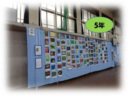 作品展の作品は,1・3・5年が平面作品,2・4・6年が立体作品でした。今年度より書写・習字については,教室掲示としました。そのため,会場もすっきりとまとまっていました。