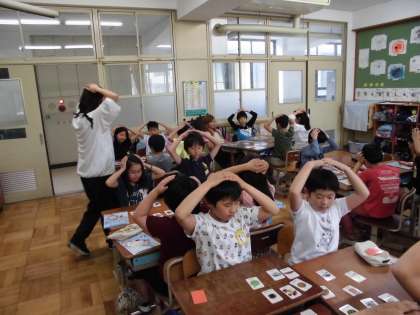 外国語活動では世界各地のあいさつについて知ったり,好きな食べ物のカルタをしたり楽しく学習を進めています。英語の「Hello!!」だけではなく,インドネシアの「Selamat siang!!」やケニアの「Jambo!!」などいろいろな国のあいさつを知り,自己紹介をしあいました。これからも楽しく学習をすすめていけたらいいなと思います。