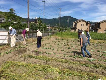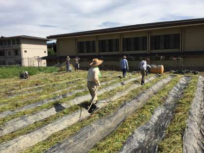 保湿のために,植えた苗の上に刈った草を被せます。保湿や雑草が生えることを防ぐために,畝の谷はフィルムで覆いマルチングを行います。夏休み前には,不定根を切る作業を行います。