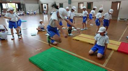 体力テストをしました。まずは,体育館でのメニューからです。「反復横とび」や「立位体前屈」などです。どの子も楽しみながら取り組んでいました。