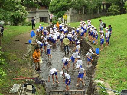 魚つかみの活動を行いました。水は冷たく,逃げる魚を捕まえるのはたいへんでしたが,自然と触れ合うよい経験になりました。