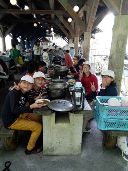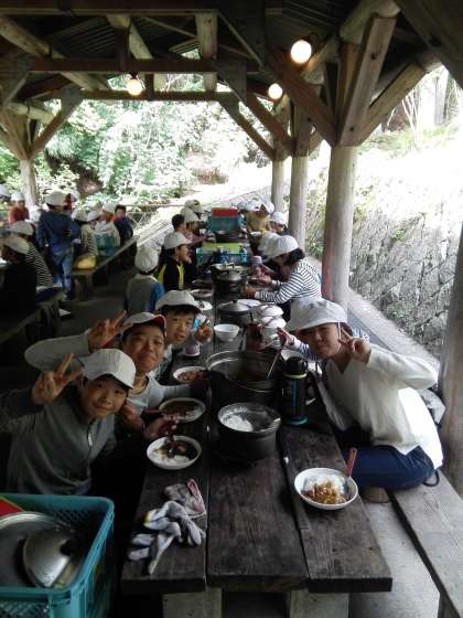 2日目の野外炊事では,カレーライスをつくりました。昨日の経験が活かされて,みんなで協力して手際よくつくることができました。自分たちでつくったカレーライスは,とてもおいしかったようで,みんなもりもり食べていました。
