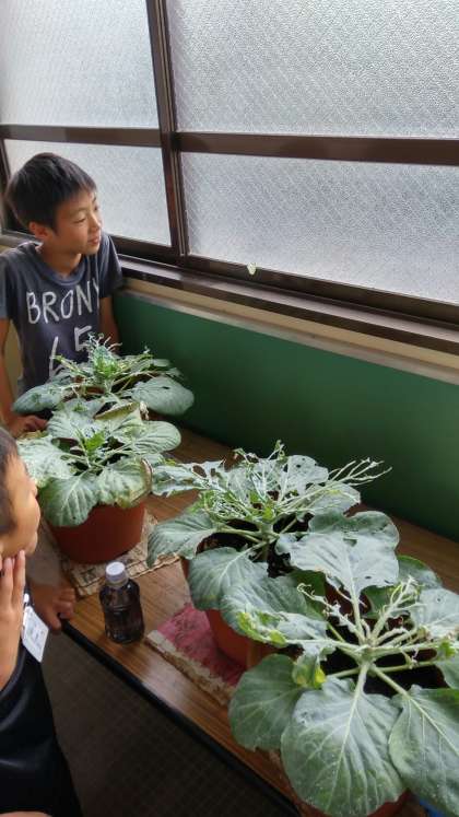 理科の「こん虫をそだてよう」の学習で育ち方を確かめるために,モンシロチョウの幼虫からキャベツの苗で育ててきました。たくさん育って,さなぎから次々と羽化したチョウを観察することができました。