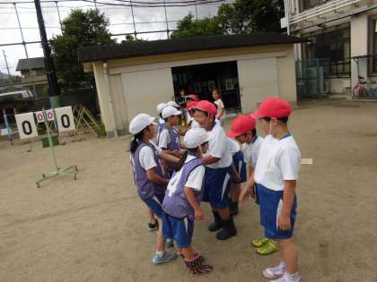 体育科で,ハンドベースボールをしています。攻撃する人は,柔らかいゴムボールをティーポストの上において打ちます。なかなかボールを受けることが難しいのですが,次の塁に向けてすすむように声援を送っています。