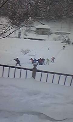 今日のめあては「工夫」です。子どもたちは,3校合同の朝の集いの後,朝食をとり,グランドへと出かけました。午前中は,ここで歩くスキーを体験します。深い雪に初めのうちは悪戦苦闘していましたが,だんだん慣れて気持ちよく歩く姿が見られるようになって来ました。